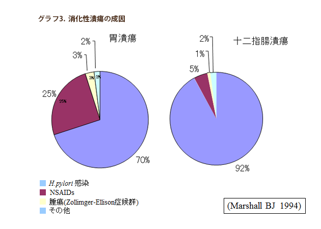 (グラフ3)によると胃潰瘍の70%、十二指腸潰瘍の90%がピロリ菌に関連しているとわかります。